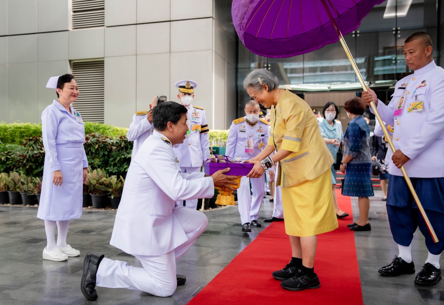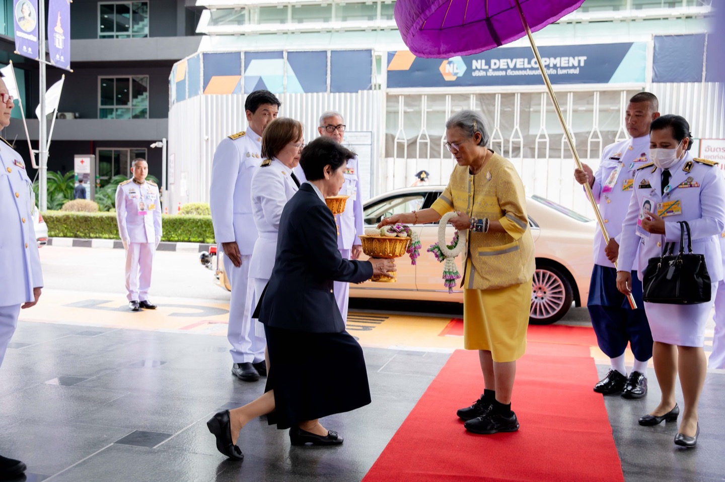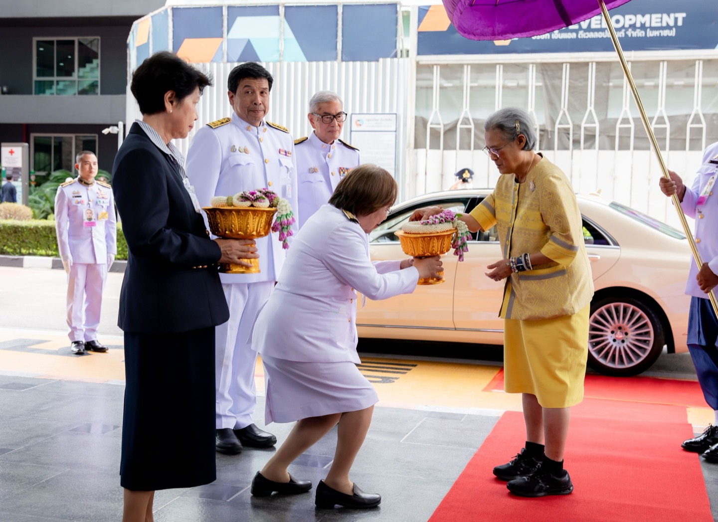 เมื่อเสด็จถึง ศาสตราจารย์พิเศษ ดร.สุรเกียรติ์ เสถียรไทย นายกสภาจุฬาลงกรณ์มหาวิทยาลัย นายเตช บุนนาค เลขาธิการสภากาชาดไทย ศาสตราจารย์ ดร.วิเลิศ ภูริวัชร อธิการบดี จุฬาลงกรณ์มหาวิทยาลัย และ รองศาสตราจารย์ นายแพทย์ฉันชาย สิทธิพันธุ์ คณบดี คณะแพทยศาสตร์ จุฬาลงกรณ์มหาวิทยาลัย เฝ้าฯ รับเสด็จ