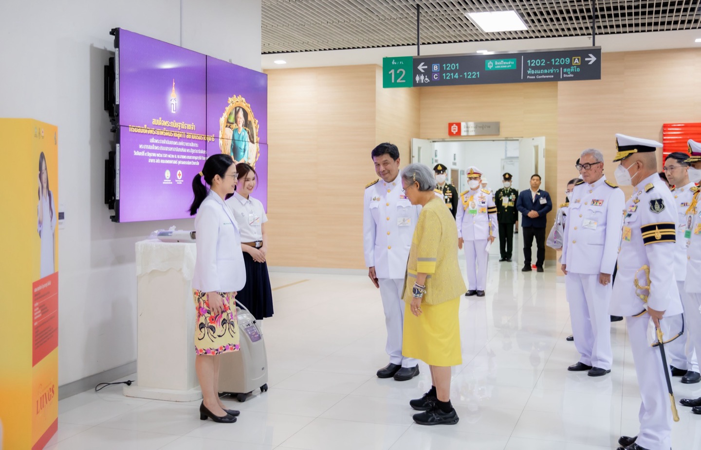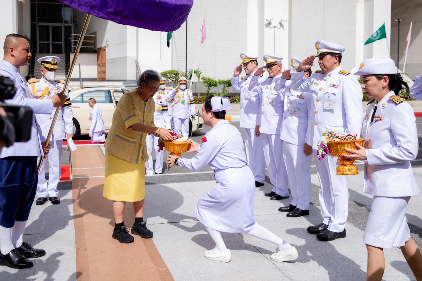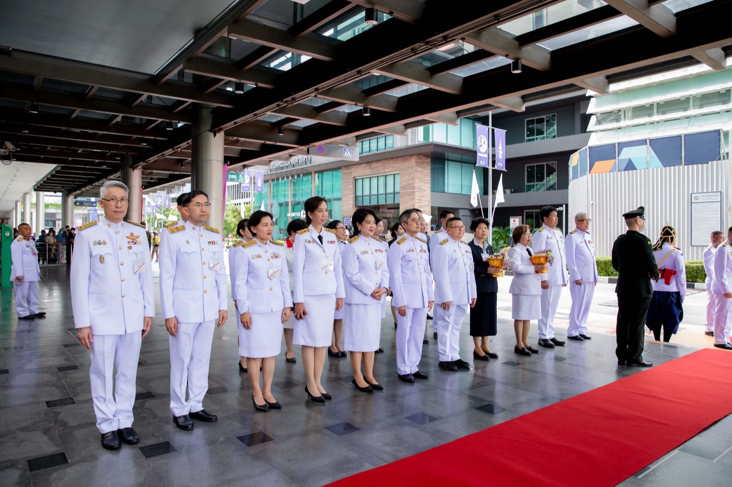 เมื่อเสด็จถึง ศาสตราจารย์พิเศษ ดร.สุรเกียรติ์ เสถียรไทย นายกสภาจุฬาลงกรณ์มหาวิทยาลัย นายเตช บุนนาค เลขาธิการสภากาชาดไทย ศาสตราจารย์ ดร.วิเลิศ ภูริวัชร อธิการบดี จุฬาลงกรณ์มหาวิทยาลัย และ รองศาสตราจารย์ นายแพทย์ฉันชาย สิทธิพันธุ์ คณบดี คณะแพทยศาสตร์ จุฬาลงกรณ์มหาวิทยาลัย เฝ้าฯ รับเสด็จ
