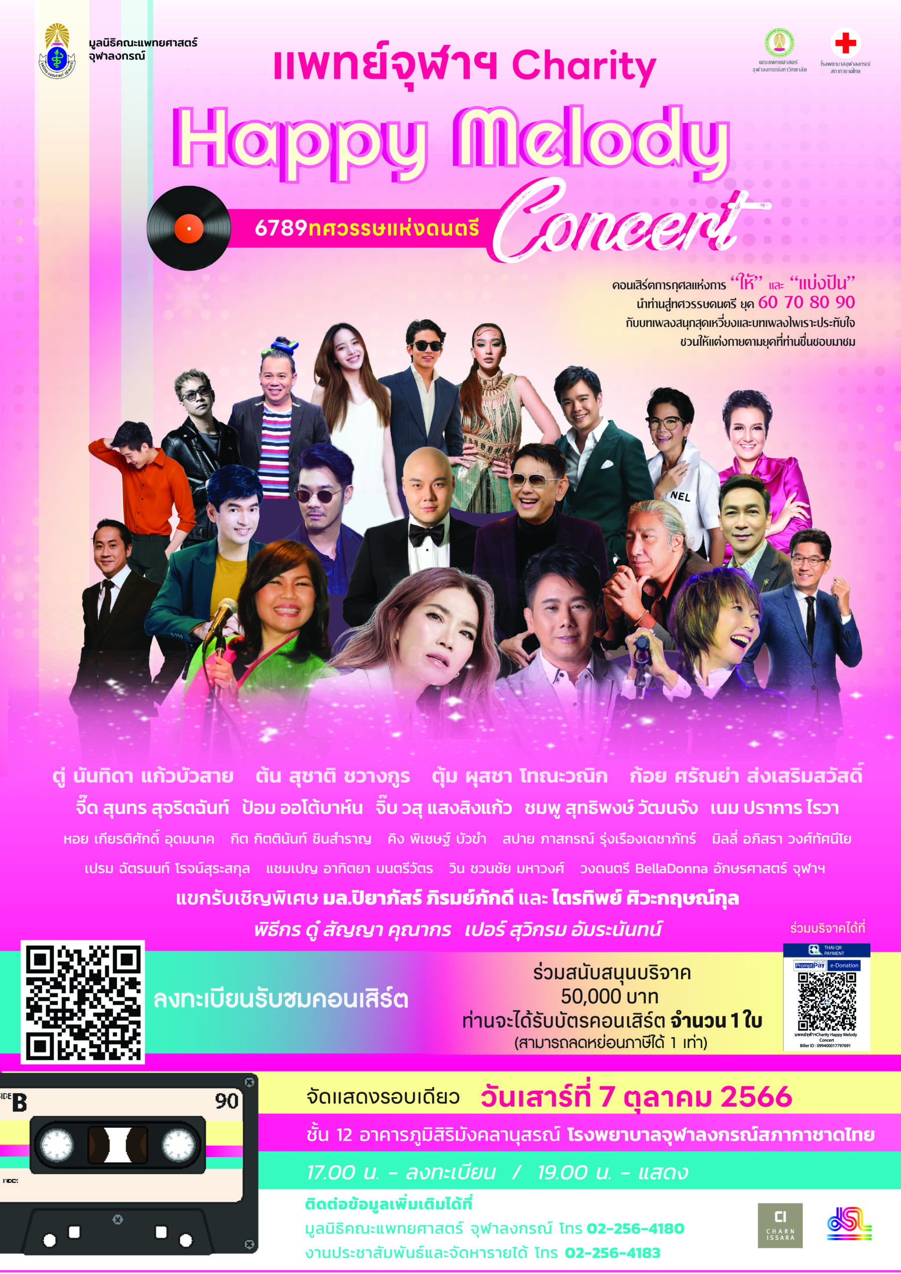 รศ.นพ.พินิจ กุลละวณิชย์ กล่าวว่า มูลนิธิคณะแพทยศาสตร์ จุฬาลงกรณ์ เป็นหน่วยงานที่จัดตั้งขึ้นมาเพื่อสนับสนุนการทำงานของคณะแพทยศาสตร์ จุฬาฯ โดย คณาจารย์ คณะแพทยศาสตร์ จุฬาลงกรณ์มหาวิทยาลัย ศิษย์เก่าแพทย์จุฬาฯ และผู้มีจิตศรัทธา เพื่อรองรับและสนับสนุนการบริหารงานของ คณะแพทยศาสตร์ ส่งเสริมและสนับสนุนการศึกษา การอบรม การค้นคว้าวิจัยและการสวัสดิการ รวมทั้งส่งเสริมและสนับสนุนการรักษาพยาบาลของ คณะแพทยศาสตร์ จุฬาฯ และโรงพยาบาลจุฬาลงกรณ์ สภากาชาดไทย ซึ่งมูลนิธิฯ ได้รับอนุมัติจากกระทรวงมหาดไทย ให้จดทะเบียนเป็นองค์กรสาธารณกุศล เมื่อวันที่ 23 พฤศจิกายน พ.ศ. 2525 โดยในวันเสาร์ที่ 7 ตุลาคม พ.ศ. 2566 มูลนิธิคณะแพทยศาสตร์ จุฬาลงกรณ์ ร่วมกับ คณะแพทยศาสตร์ จุฬาฯ โรงพยาบาลจุฬาลงกรณ์ สภากาชาดไทย บมจ.ชาญอิสสระ ดีเวล็อปเมนท์ จำกัด (มหาชน) และ บริษัท เจ เอส แอล โกลบอล มีเดีย จำกัด (JSL) ได้กำหนดจัดกิจกรรมคอนเสิร์ตการกุศล “แพทย์จุฬาฯ Charity Happy Melody Concert” #6789 ทศวรรษแห่งดนตรี ตั้งแต่เวลา 17.00 น. เป็นต้นไป ณ ห้องประชุม 1210 ชั้น 12 อาคารภูมิสิริมังคลานุสรณ์ โรงพยาบาลจุฬาลงกรณ์ สภากาชาดไทย กิจกรรมคอนเสิร์ตการกุศลในครั้งนี้จัดขึ้นเพื่อหารายได้สนับสนุนด้านการศึกษา ค้นคว้างานวิจัยของคณะแพทยศาสตร์ จุฬาฯ ที่เป็นแหล่งความรู้ด้านการแพทย์ตลอดจนการสร้างชุมชนแห่งการเรียนรู้ ที่ก้าวขึ้นเป็นศูนย์กลางแห่งการเชื่อมโยงแลกเปลี่ยนองค์ความรู้ด้านสาธารณสุขในระดับประเทศ และสนับสนุนให้การรักษาพยาบาลของโรงพยาบาลจุฬาลงกรณ์ สภากาชาดไทย