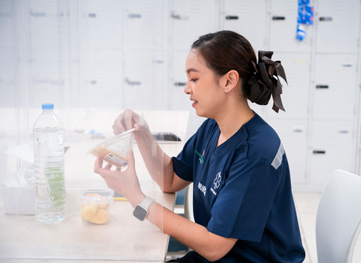 “การทำงานที่นี่แบ่งเวรเป็น 3 กะ เวรเข้าเริ่มตั้งแต่เวลา 07.30-15.30 น. จะไม่ค่อยมีปัญหาเรื่องการเดินทางหรือการกินเท่าไร เพราะตารางเวลาคล้ายคนทำงานออฟฟิศ จะมีเวรบ่าย (เวลา 15.30-23.30 น.) กับเวรดึก (เวลา 23.30-07.30 น.) ที่อาจต้องเตรียมอาหารมาจากบ้าน หรือโทร.สั่งดิลิเวอรีมาส่ง ในแต่ละสัปดาห์ทุกคนจะได้ขึ้นเวรหมุนเวียนกันครบทุกกะ ถ้ามีการควบเวรเต็มที่ก็คือเวรเช้ากับเวรดึก อย่างน้อยต้องเว้น 8 ชั่วโมง และถึงแม้ว่าเรามีเวลาพักกินข้าว แต่บางครั้งก็ขึ้นอยู่กับคนไข้ เพราะในแผนกฉุกเฉินเราคาดการณ์อะไรไม่ได้ ทำให้เราต้องกินข้าวอย่างรวดเร็ว และพร้อมกลับมาปฏิบัติงานต่อเลย”