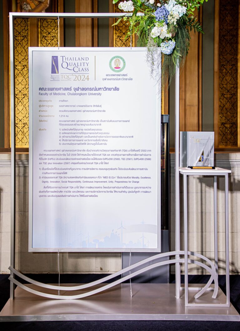 ในโอกาสนี้ คณะแพทยศาสตร์ จุฬาลงกรณ์มหาวิทยาลัย ได้รับรางวัลการบริหารสู่ความเป็นเลิศที่มีความโดดเด่นด้านนวัตกรรม (Thailand Quality Class Plus: TQC Plus) และ รศ.นพ.ฉันชาย สิทธิพันธุ์ ได้รับรางวัลเชิดชูเกียรติ Leadership Excellence Award ในฐานะผู้บริหารที่มีศักยภาพโดดเด่นบนเส้นทางแห่งความเป็นเลิศ พร้อมแบ่งปันความรู้และประสบการณ์ในฐานะต้นแบบองค์กรที่ประสบความสำเร็จ